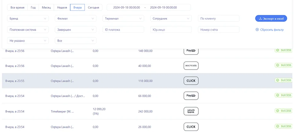 На странице платеж, все транзакции оплаты счетов и чаевых. На данной странице вы можете отменить транзакцию. Отфильтровать оплаты по периодам и выгрузить необходимый период. Так же есть возможность увидеть детали платежа, и дату возмещения оплаты заведению.