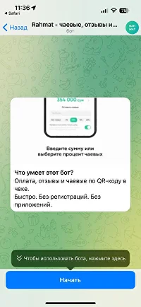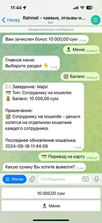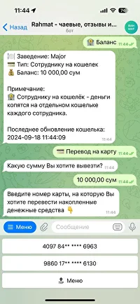 Вывод чаевых происходит через бот, официант может указать номер пластиковой карты и вывести