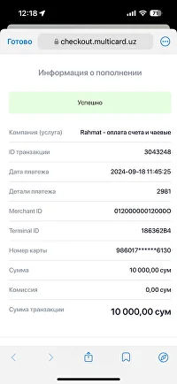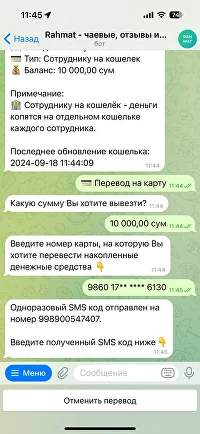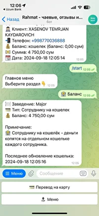 После того, как пользователь нажмет на кнопку ‘Баланс’, следующим сообщением придет информация о балансе. Если пользователь хочет вывести свои деньги, то нужно нажать на кнопку ‘Перевод на карту’ и выбрать определенную сумму. После этого бот попросит у пользователя номер карты. Номер карты нужно прописать пользователю (карта должна быть Uzcard или Humo)
