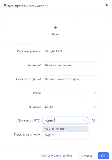 сотрудника (вводим на кириллице), номер телефона, выбираем роль из предоставленного списка,
